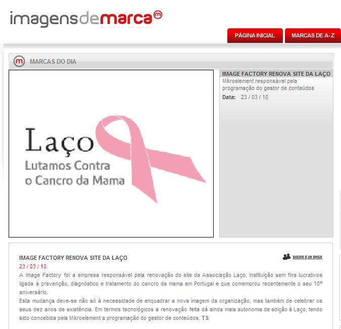 "A Image Factory foi a empresa responsável pela renovação do site da Associação Laço, instituição sem fins lucrativos ligada à prevenção, diagnóstico e tratamento do cancro da mama em Portugal. (...) Em termos tecnológicos a renovação feita dá ainda mais autonomia de edição à Laço, tendo sido concebida pela Mikroelement a programação do gestor de conteúdos."